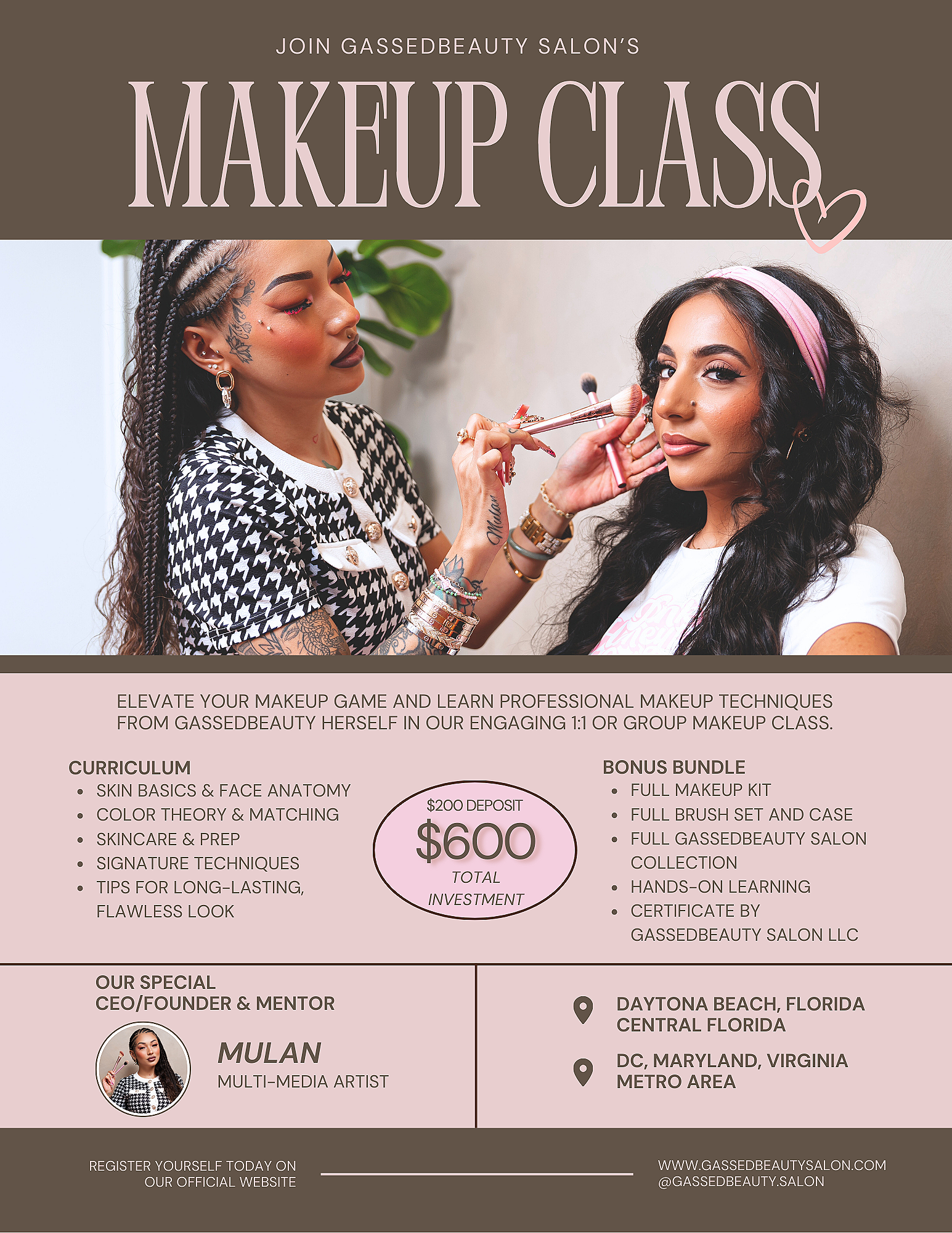 Whether you’re a beginner wanting to perfect your everyday look or a pro aiming to expand your artistry, our classes at GassedBeauty Salon are tailored to your needs. We cover makeup fundamentals, personalized tips, and our signature techniques for flawless results. From skin prep and color matching to seamless blending and long-lasting finishes, you’ll gain the skills and confidence to take your makeup to the next level.